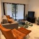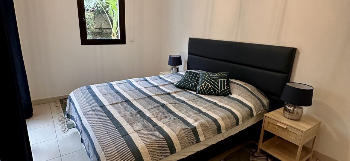 Au rez-de-chaussée il est composé de: un séjour avec une cuisine ouverte, une table à manger, deux chambres, une salle de bains, deux WC, des placards dans chaque chambre et deux terrasses. Entièrement climatisé avec une piscine et une place de parking au sein de la résidence.