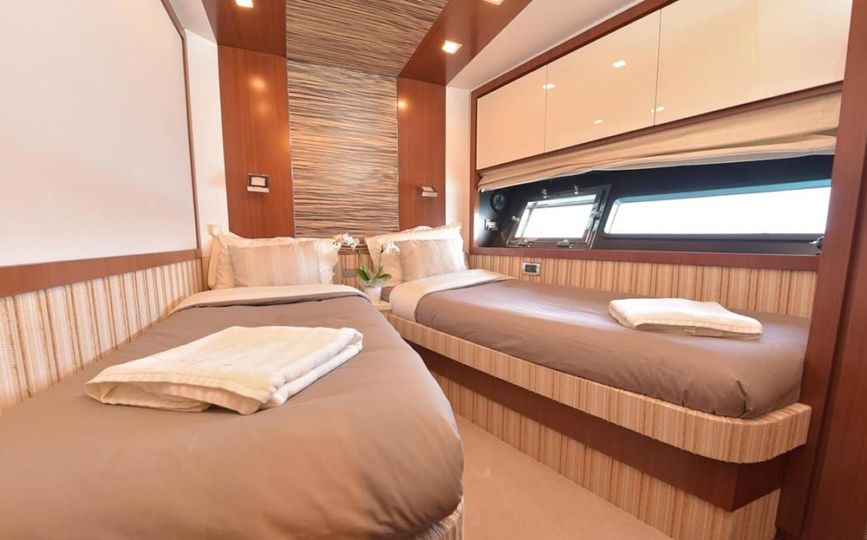 À bord de ce beau Baia Italia 70, vous trouverez trois cabines très bien ajustées avec des fenêtres latérales ouvrantes, pouvant accueillir six personnes. Il y a aussi une plateforme de baignade à bord.