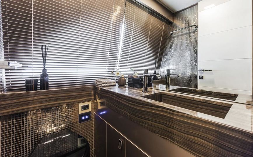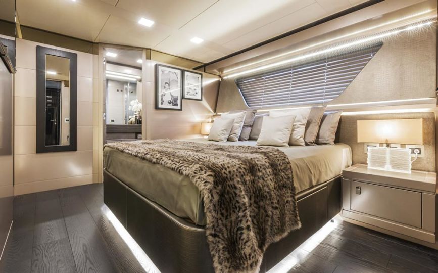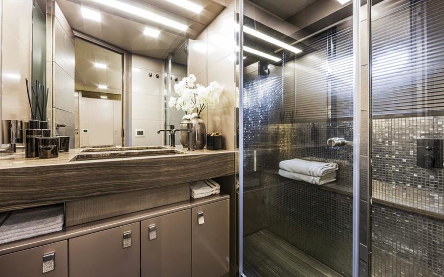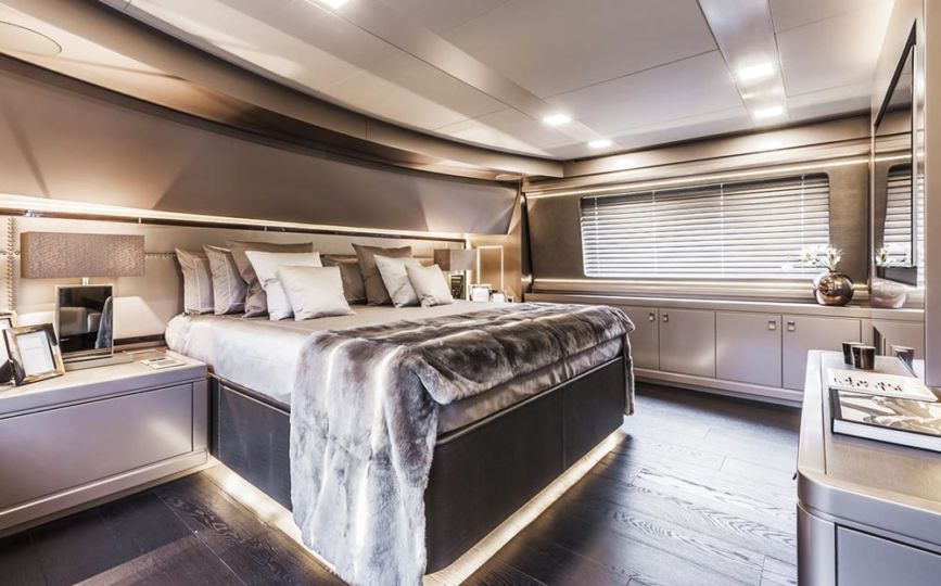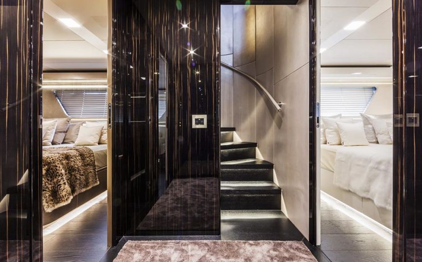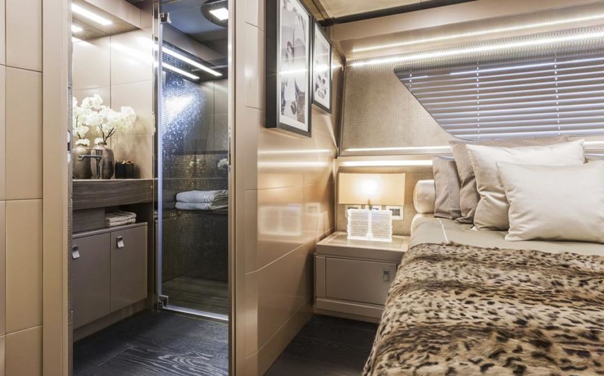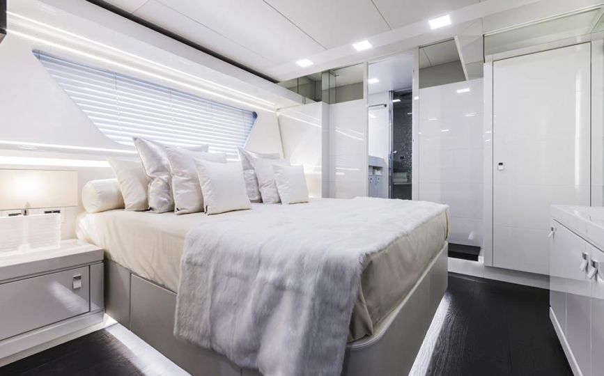 Le cockpit offre une zone de bain de soleil multifonctionnelle et originale. La cabine principale sur le pont principal à l’avant a un grand dressing, de grandes fenêtres et une salle de douche qui peut être convertie en bain turc. Sous le pont, un hall central mène aux quatre cabines invités, dont trois doubles et une équipée de lits jumeaux.