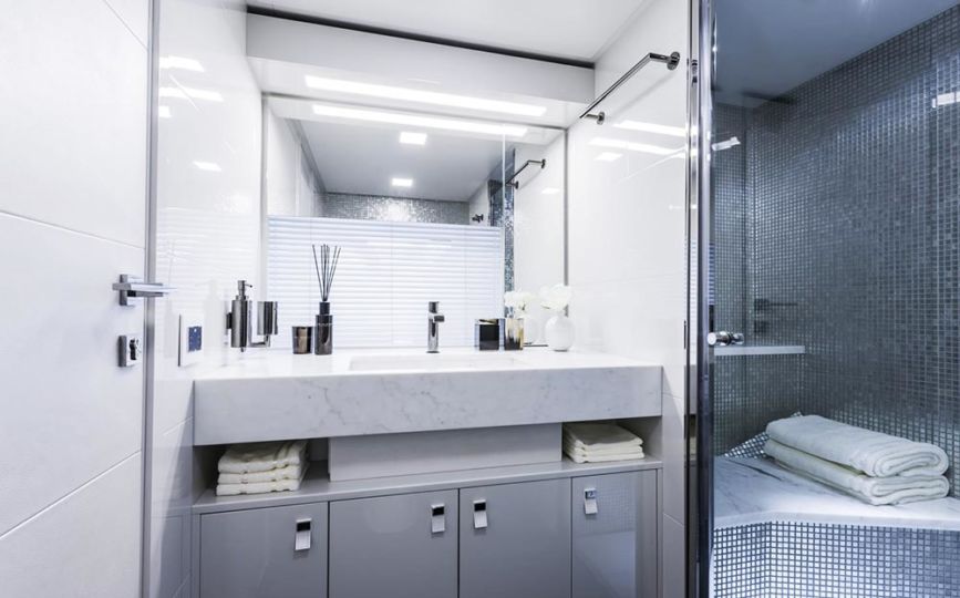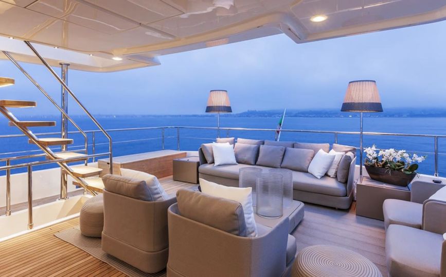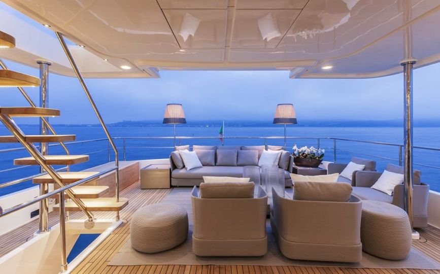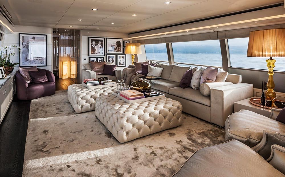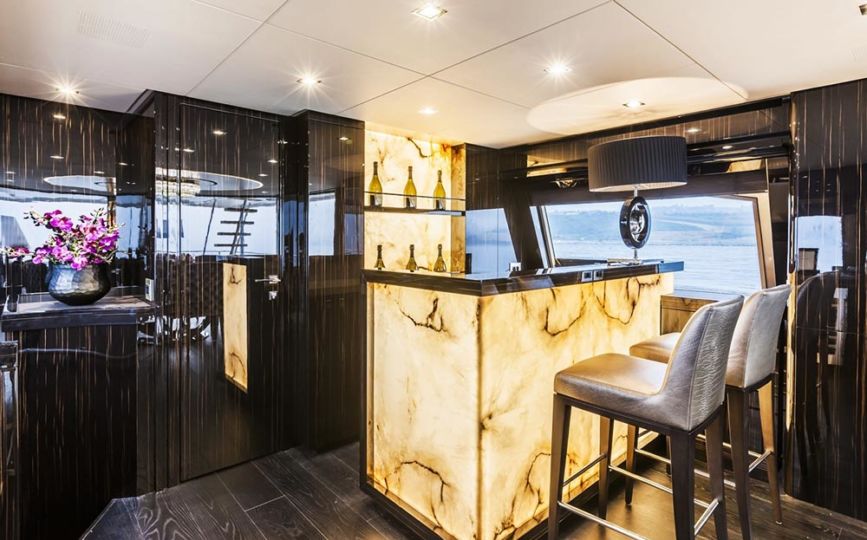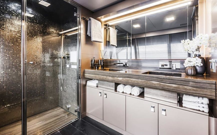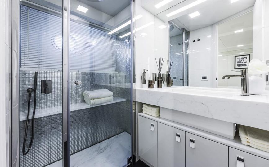 Le cockpit offre une zone de bain de soleil multifonctionnelle et originale. La cabine principale sur le pont principal à l’avant a un grand dressing, de grandes fenêtres et une salle de douche qui peut être convertie en bain turc. Sous le pont, un hall central mène aux quatre cabines invités, dont trois doubles et une équipée de lits jumeaux.