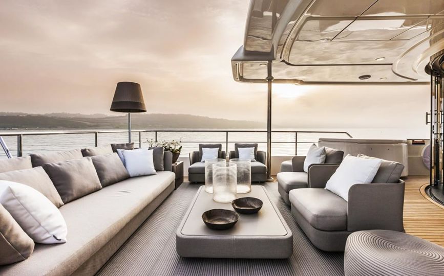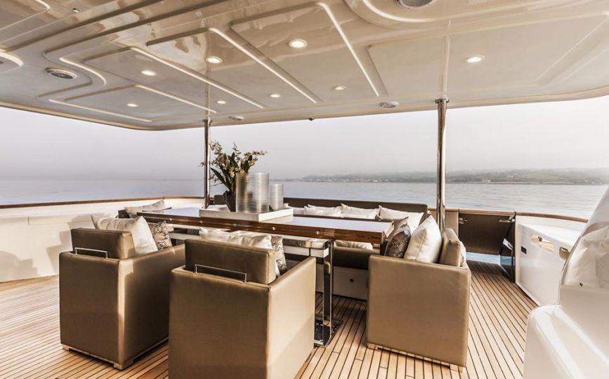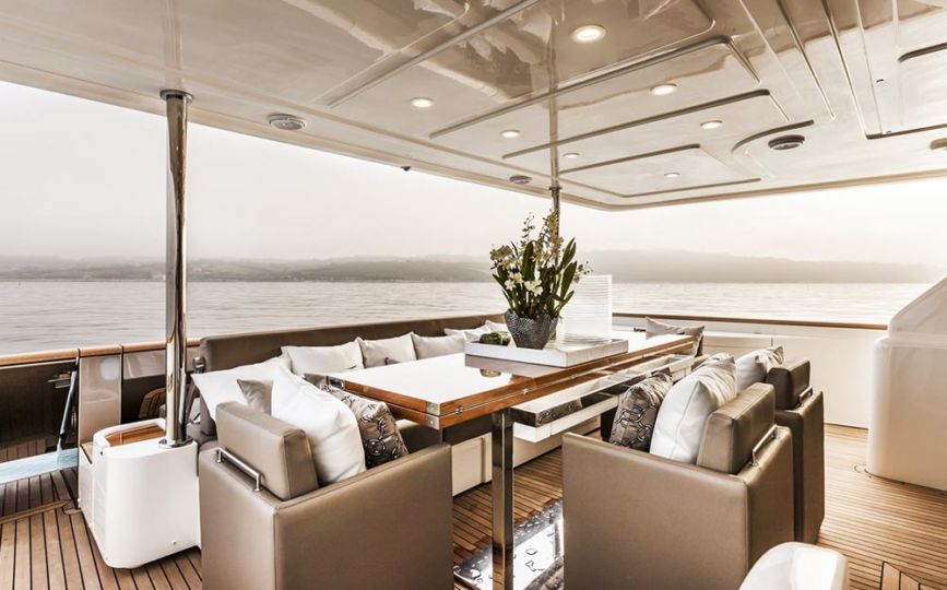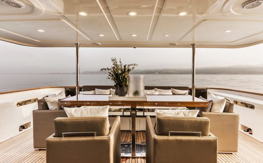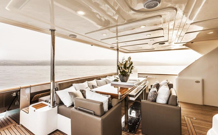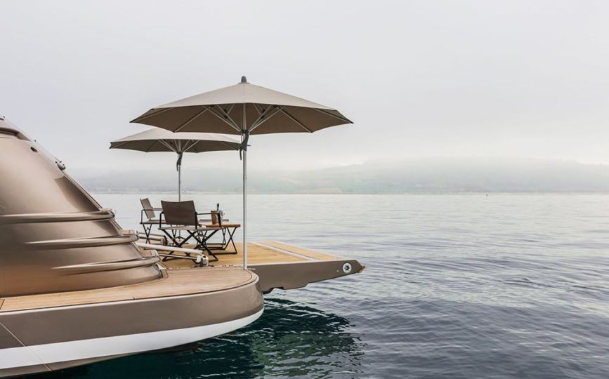 Le pont supérieur panoramique dominé par le système de portes coulissantes vitrées circulaires emmène à la salle à manger. Un écran de télévision dissimulé dans le plafond extérieur peut être, grâce à son système de rotation à 180°, regardé à la fois de l’extérieur et de la salle à manger intérieure.
