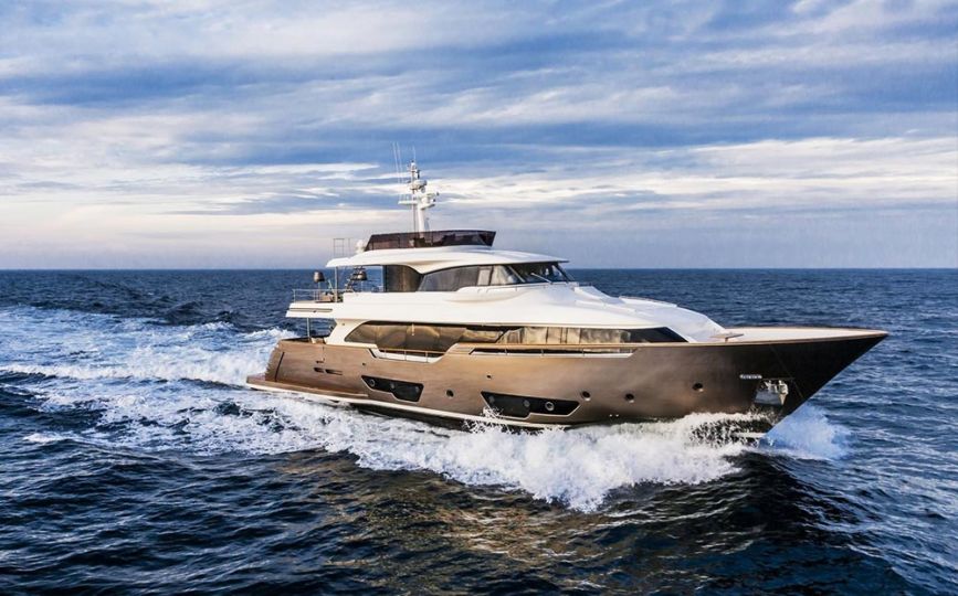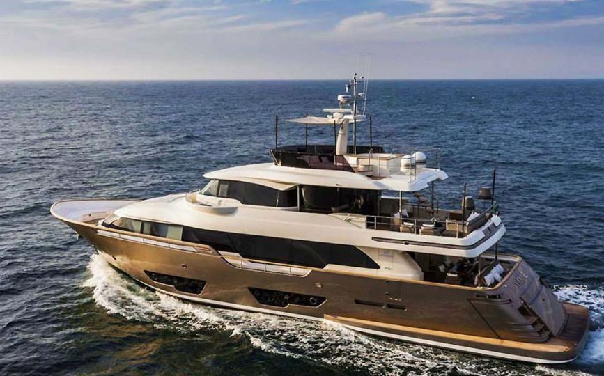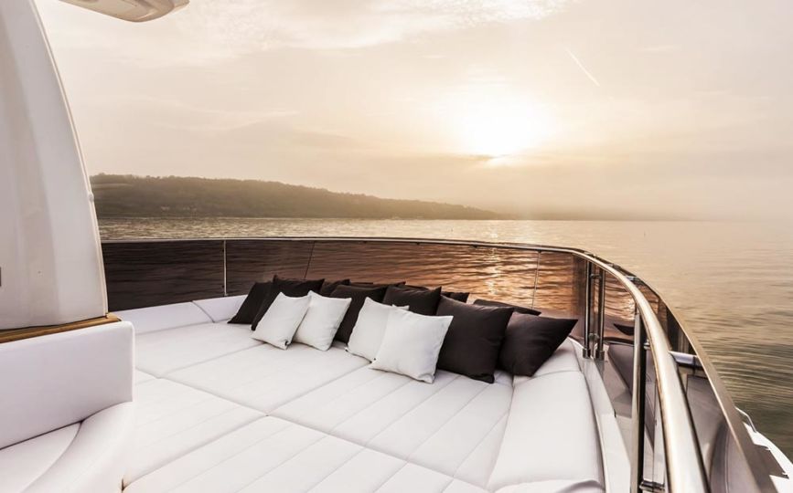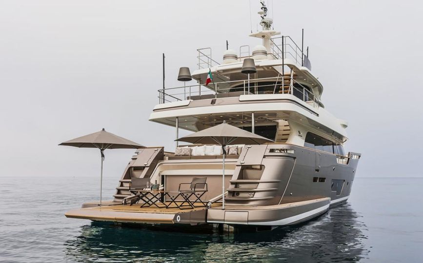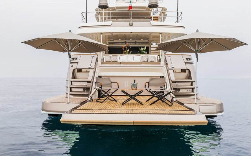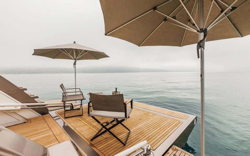 Ce magnifique yacht à moteur est très spacieux. Il est remarqué immédiatement par son garage et sa plateforme de natation absolument innovants. Dans le garage, vous trouverez un tender de 4,45 m et une plateforme de bain qui peut être étendue pour faire un espace jusqu’à 15 m², deux parasols et deux chaises, faisant de cette zone un endroit idéal pour bronzer.