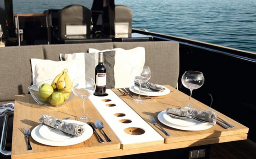 Vous pouvez embarquer à 12 personnes pour profiter d’un moment inoubliable en mer. En extérieur, la vedette Fjord offre un vaste plan de pont tout en longueur, avec une grande table convertible en un large bain de soleil. Mettez votre musique grâce au système sonore présent à bord.