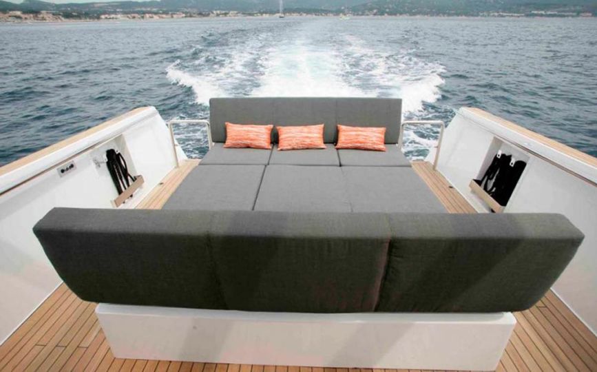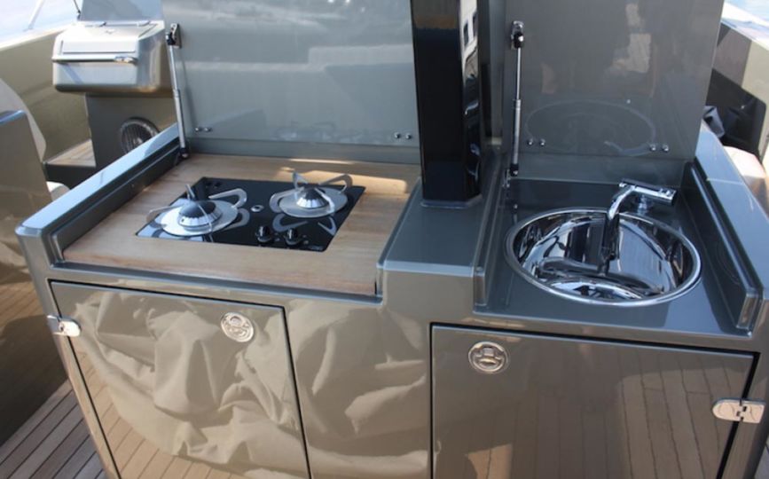 La cuisine extérieure est l’un des points forts de ce Fjord 40, un réel espace lui est dédié et comprend des plaques à gaz/plancha, réfrigérateurs et évier. Les grands bains de soleil à l’arrière de ce Fjord 40 Open our permettront de profiter du soleil. Vous pouvez également être à l’ombre grâce à la tonnelle ajustable.