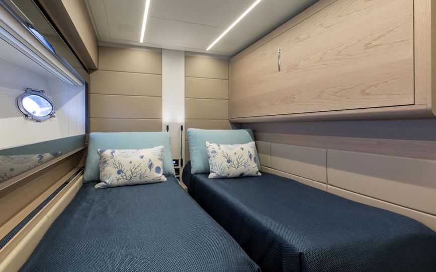 Il dispose de trois cabines fantastiques et très modernes (dont un master, un VIP et deux twin) et peut accueillir jusqu’à 8 personnes en navigation à la semaine.