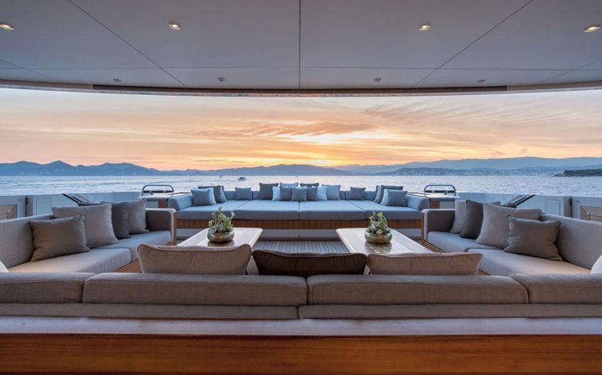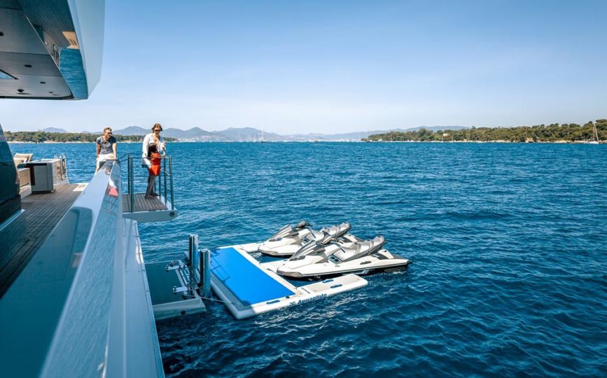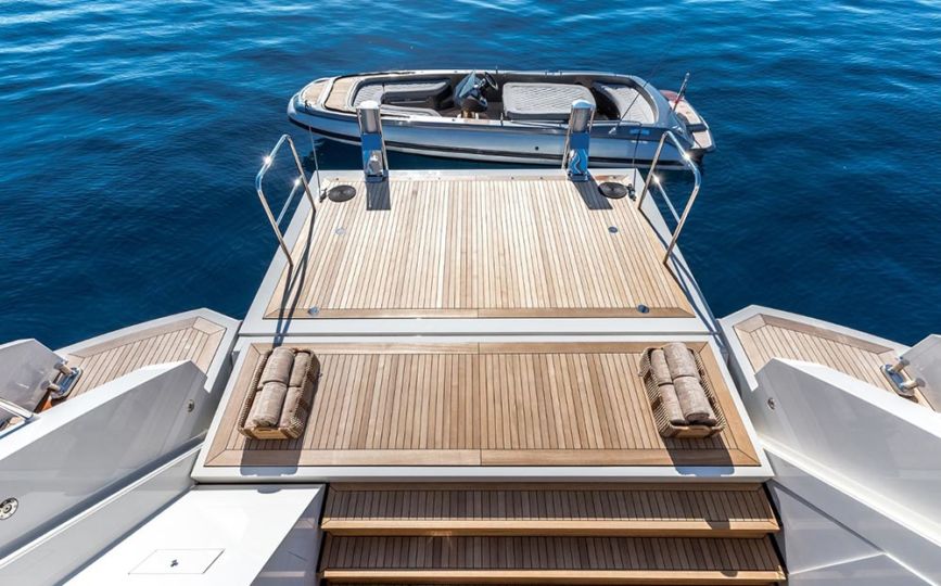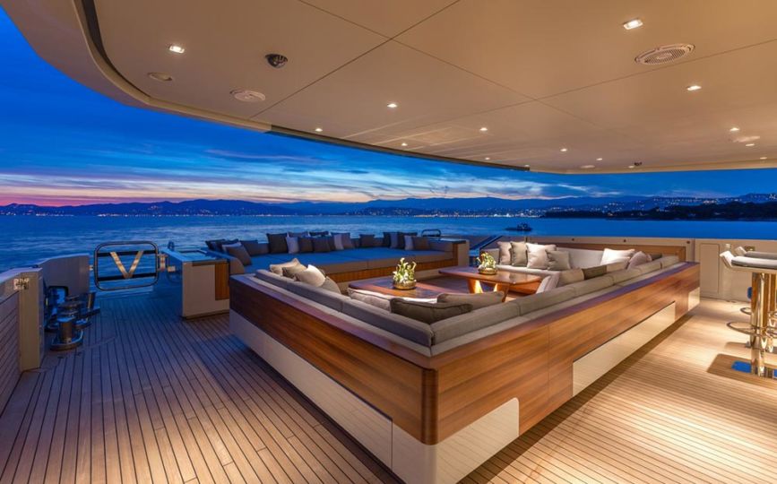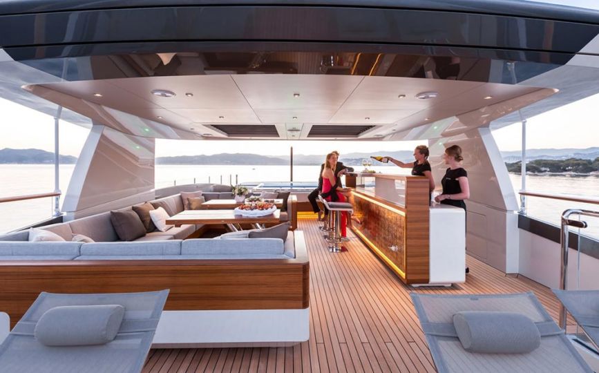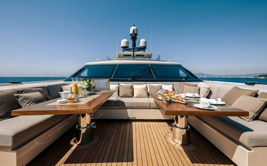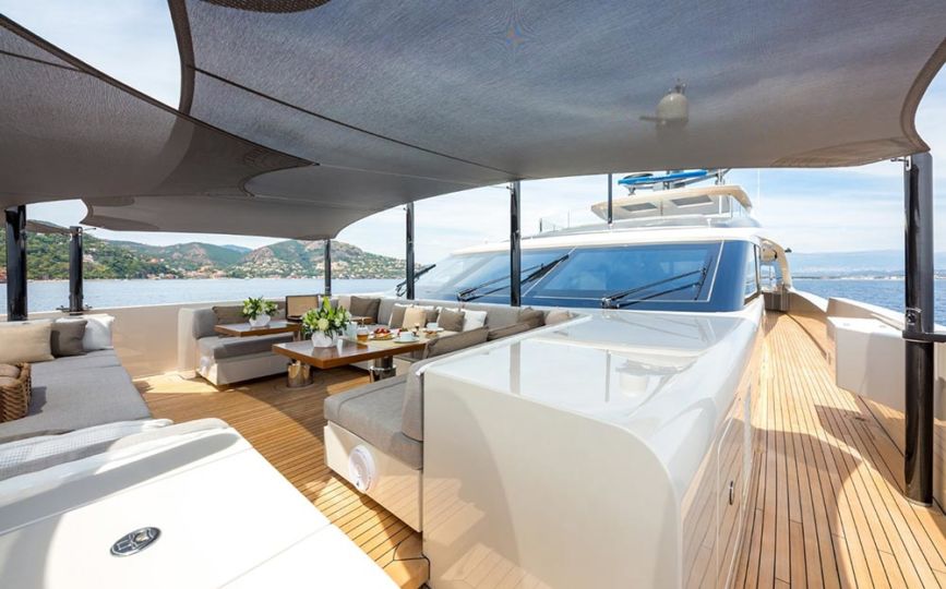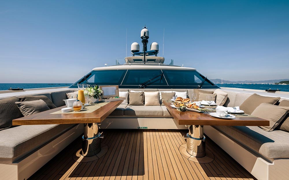 L’espace extérieur à l’arrière du pont principal offre des options de restauration en plein air, un fabuleux salon-solarium et un bar. Ce yacht propose également un jacuzzi, un bar, des chaises longues, une terrasse latérale avec un garage qui permet aux clients d’accéder aux jouets aquatiques.