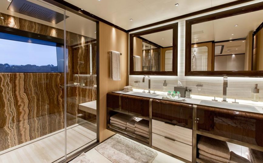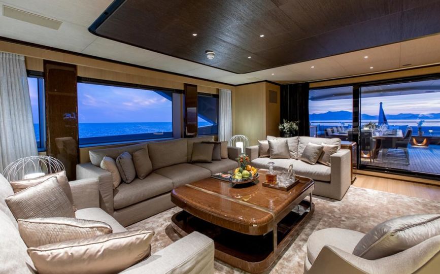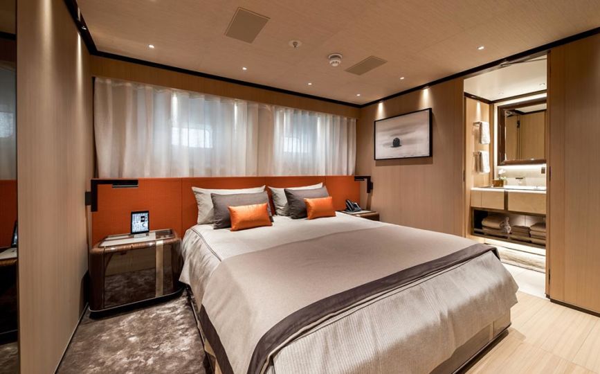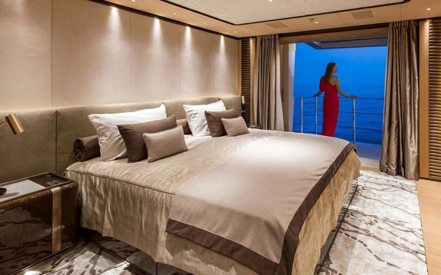 Ce super-yacht peut accueillir confortablement jusqu’à 12 personnes à bord dans les six cabines. La cabine VIP dispose d’une salle de bain privative et d’un dressing. Vers la cabine principale, le yacht dispose d’une belle cave à vin. La suite principale offre une salle de bain attenante, ainsi que deux balcons hydrauliques, qui peuvent être entièrement ouverts pour offrir une vue imprenable.
