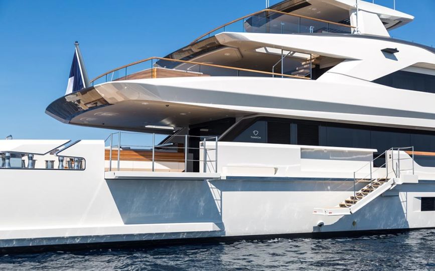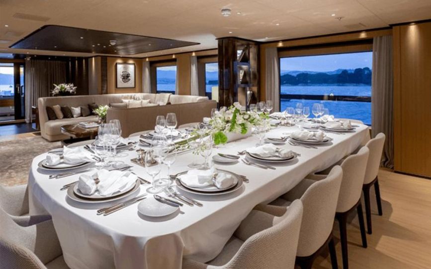 Bienvenue à bord de ce luxueux yacht Tankoa de 50 m. Le salon du pont principal est très spacieux où vous trouverez des fenêtres du sol au plafond, un grand canapé en forme de U et une table à manger formelle pouvant accueillir 12 passagers.