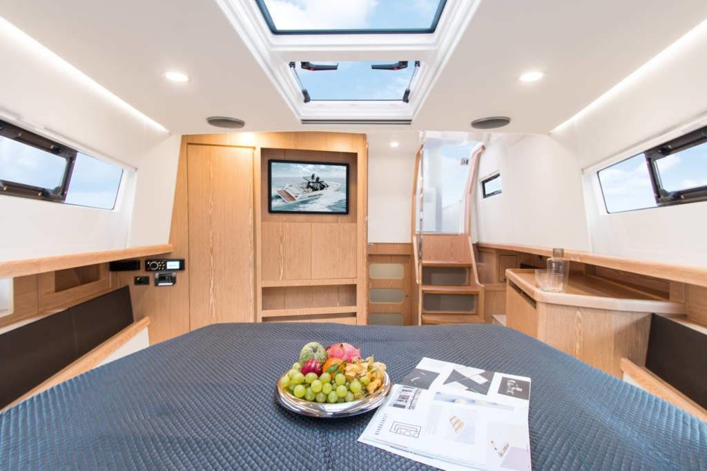 The Fjord 42 Open motor boat is both sporty and multi-purpose. The large bathing platform can be lowered hydraulically in order to bathe. The anchor is raised and stored hydraulically in the bow roller by pressing a button on the dashboard. The new T-Top has a lot of electronics, starting with the retractable soft bimini used with an electric control, which protects or uncovers the sun upon on request.