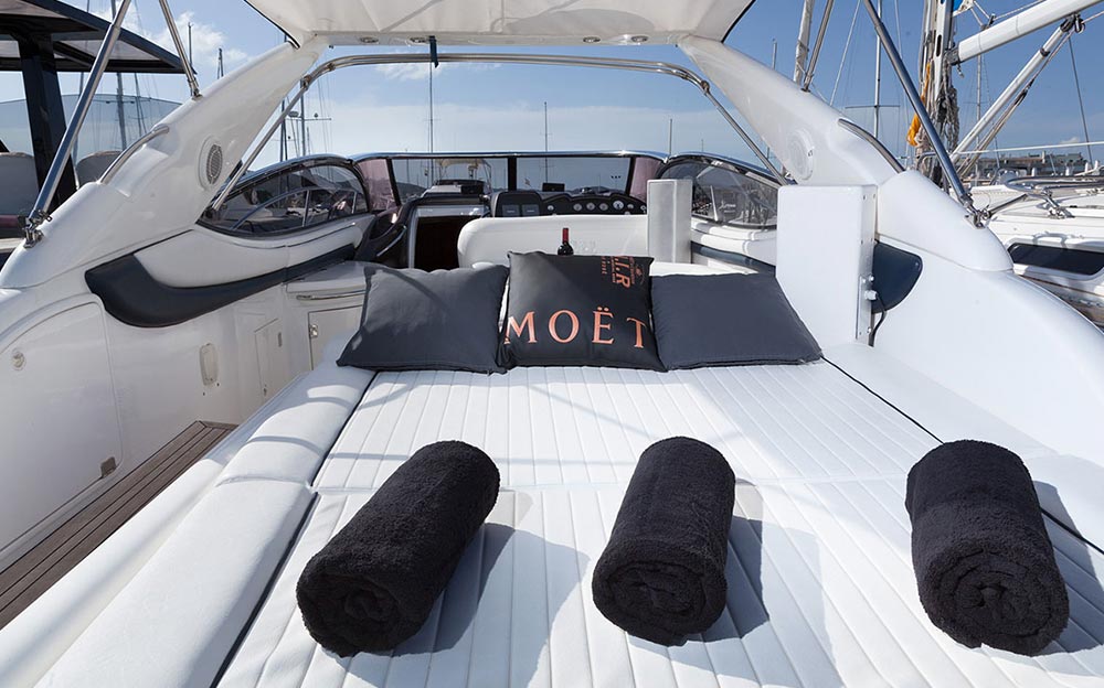 This Sunseeker 48 is 16 meters long and has a capacity for 10 people with captain. This boat offers excellent performance and comfort during navigation. With a cabin, spacious seating and large sun-beds at the front, this is a great choice if you want to spend the day relaxing in style.