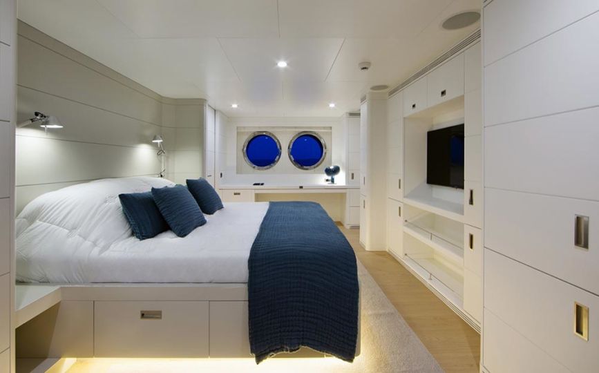 This custom displacement yacht is equipped with an ultra-modern stabilization system which reduces roll motion effect and results in a smoother more enjoyable cruising experience. She features ‘at anchor stabilisers’ which work at zero speed to increase onboard comfort at anchor and on rough waters.