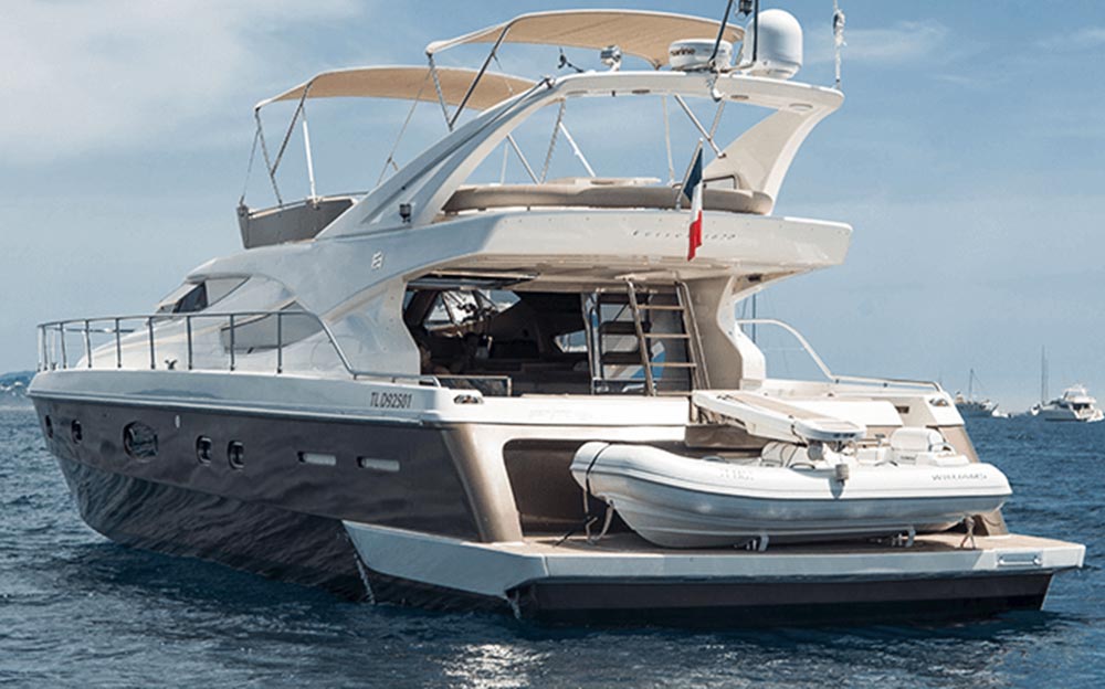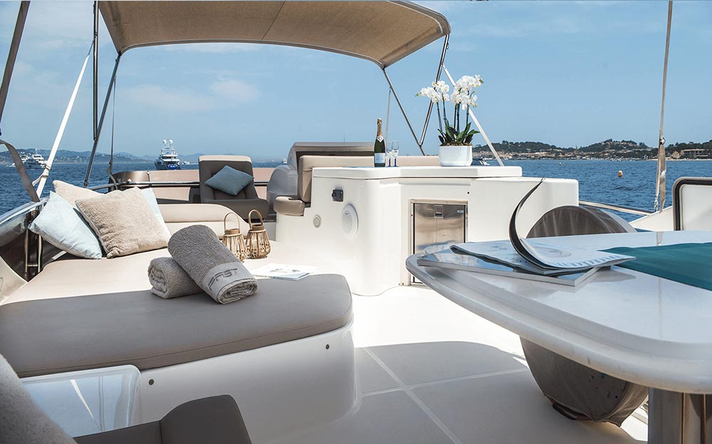 Эта яхта предлагает очень просторный флайбридж с баром, большими шезлонгами и обеденной зоной. Он полностью затенен тентом. Интерьер яхты очень хорошо продуман и имеет прекрасное естественное освещение. На этой яхте могут разместиться 12 пассажиров для однодневного круиза и 6 пассажиров с возможностью провести ночь в море. Средняя скорость в 25 узлов позволит Вам открыть для себя прекрасные города Сен-Тропе и Канны.