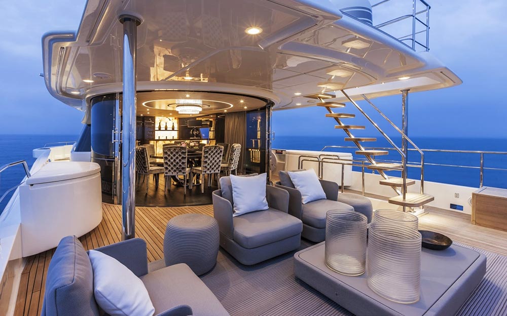 Панорамная верхняя палуба с удобной системой раздвижных дверей, с круглым остеклением, охватывает столовую. Благодаря системе поворота на 180° экран телевизора можно смотреть с наружи и изнутри обеденной зоны. Окунувшись в джакузи, Вы будите в полном уединении. На верхней палубе есть душ, навес и фонтан, льющий воду в джакузи.