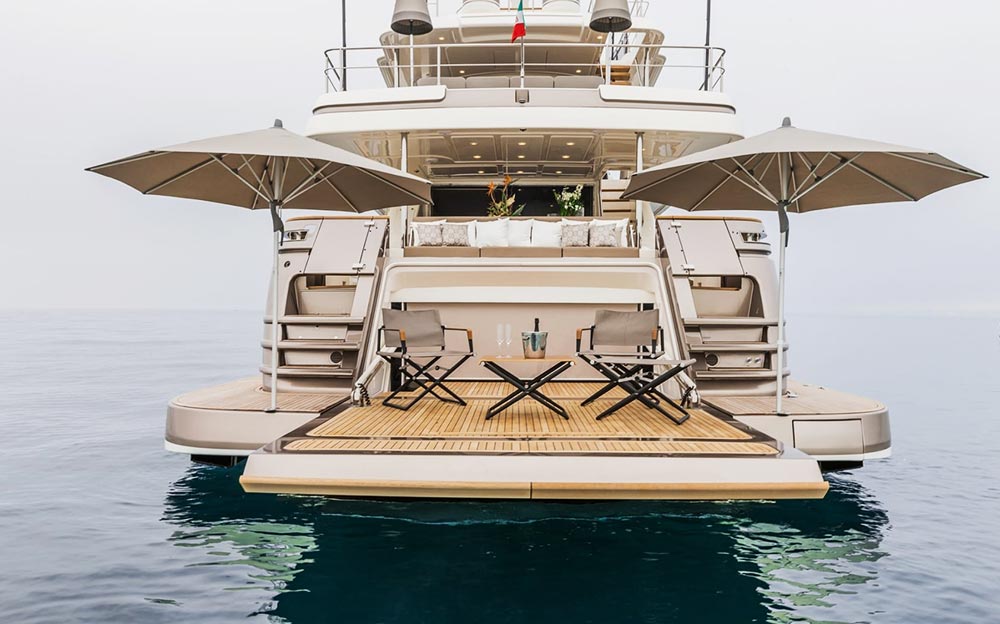 Ferretti Custom Line — красивая и просторная моторная яхта. Она сразу бросается в глаза благодаря своему совершенно инновационному гаражу и платформе для купания.